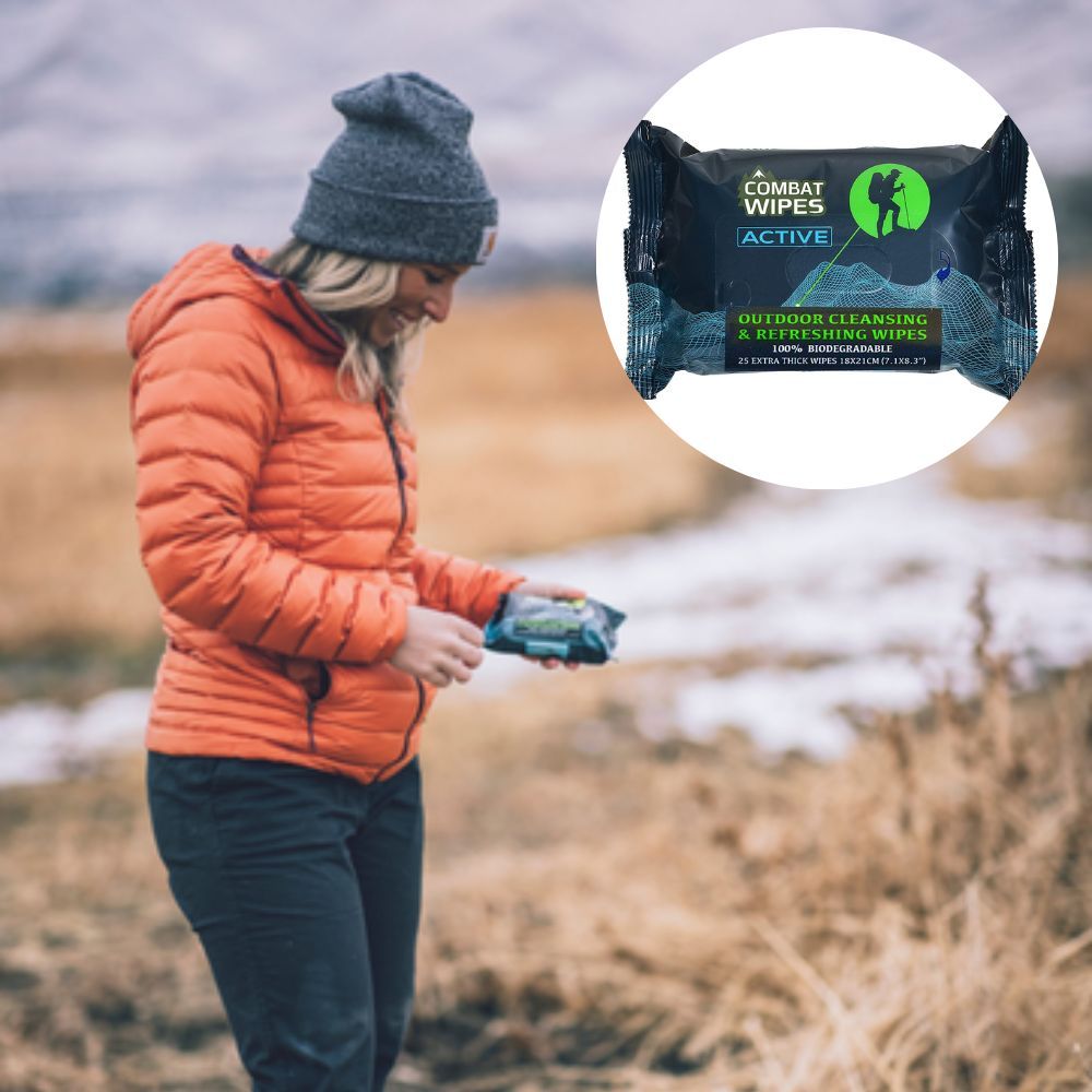 Combat Wipes ACTIVE Outdoor Wet Wipes are the perfect solution to stay clean, and even use as toilet paper, making them a priority when it comes to camping essentials for women.