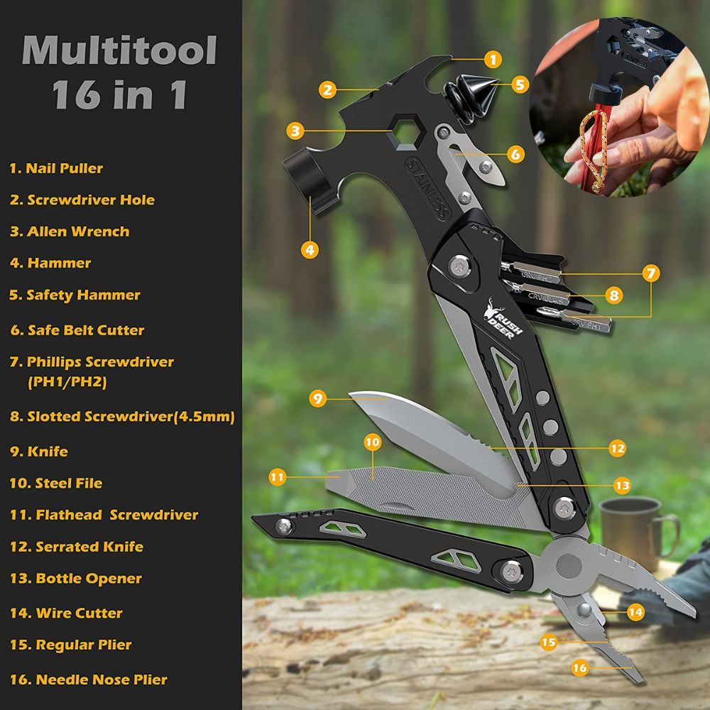 We selected this specific multi-tool for you because it is much more than a pocket knife-type multi-tool. This is a 16-in-1 survivor-style multi-tool with a hammer, glass breaker, belt cutter, screwdrivers, bottle openers, pliers, and more. The only thing this survivor-style multi-tool doesn't have is an axe.