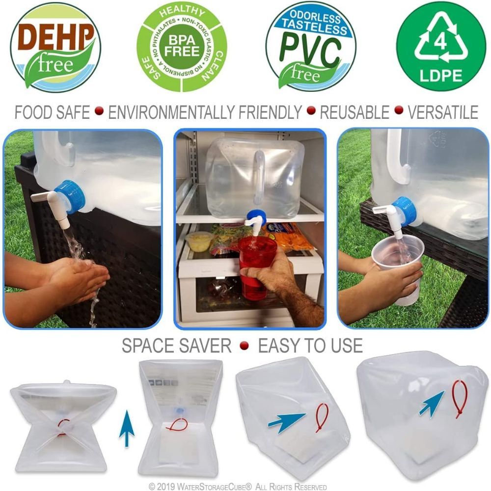 Other camping essentials related to food and water include collapsible water storage containers. This is a 2-pack of much-needed storage containers for water. These are collapsible, BPA-free and PVC free and food safe.