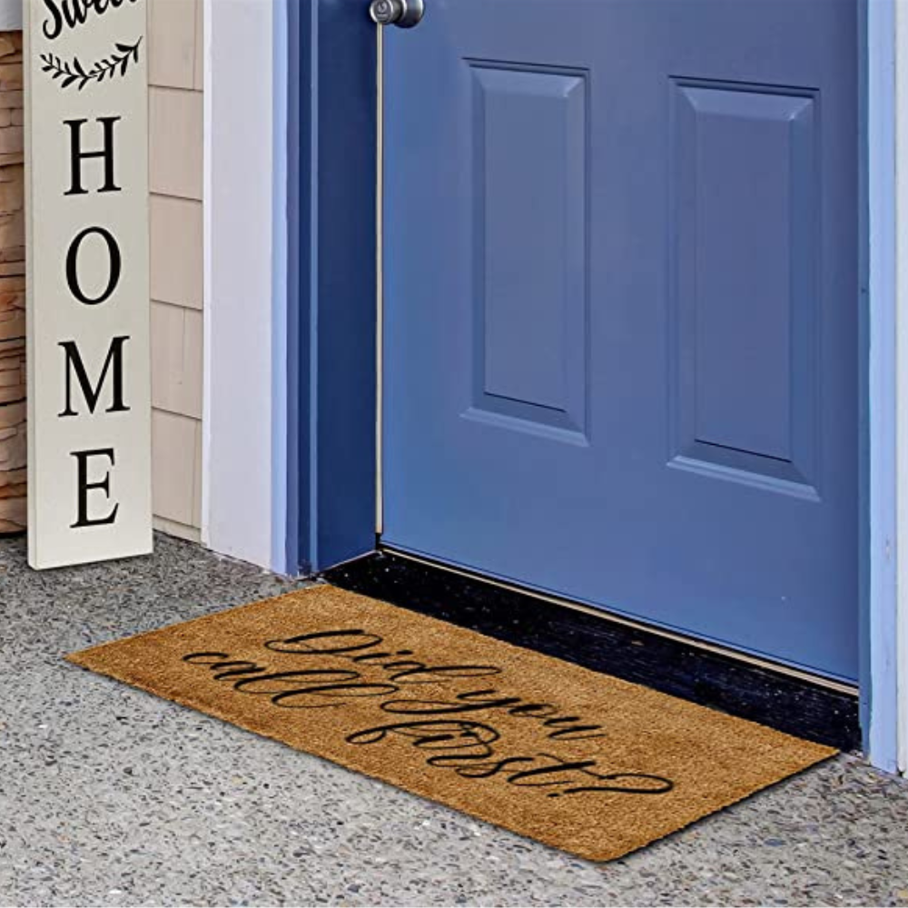 MAINEVENT Did You Call First Doormat will make your entranceway the talk of the town! This unique doormat is made from durable coir and features a whimsical phrase printed in bold black letters - so it's sure to put a smile on your guests' faces. The all-natural coir material is tough enough to stand up to whatever weather comes its way, and the natural bristles are perfect for cleaning dirt and debris off shoes before they enter your home. Plus, it's easy to clean with a shake or a vacuum, so you can enjoy this Funny Doormat for years to come. So make sure you call first and get your hands on this one-of-a-kind Funny Doormat today!