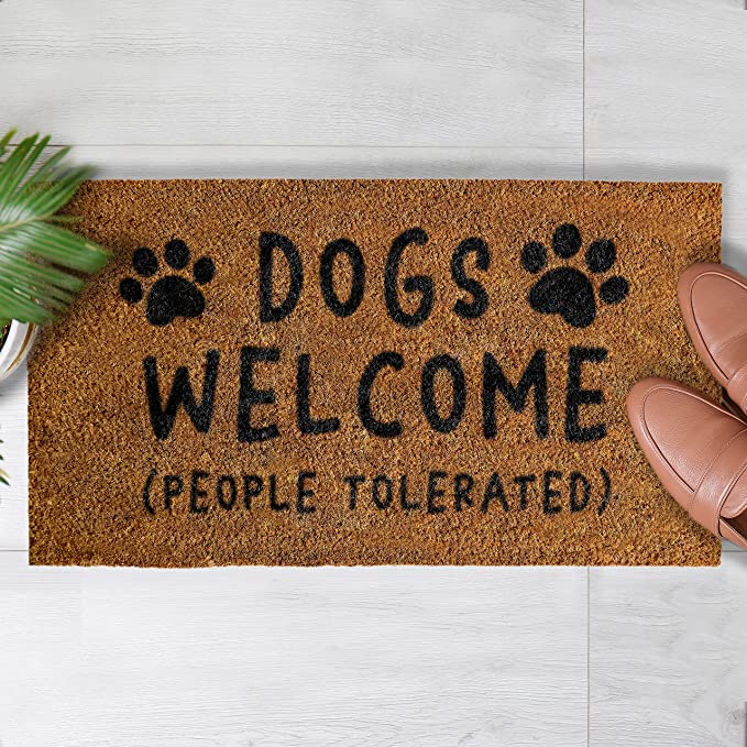 This Funny Doormat Dogs Welcome People Tolerated is perfect for anyone who loves their dog and has a great sense of humor. This doormat features an amusing message which will welcome everyone to your door with a chuckle. The doormat is made from durable, natural coir fiber that is tough enough to withstand the elements, while still looking great. It is also skid-resistant and has a rubber backing to ensure it stays firmly in place. The Dogs Welcome People Tolerated Doormat is sure to be a hit with friends and family, making an excellent addition to any home.