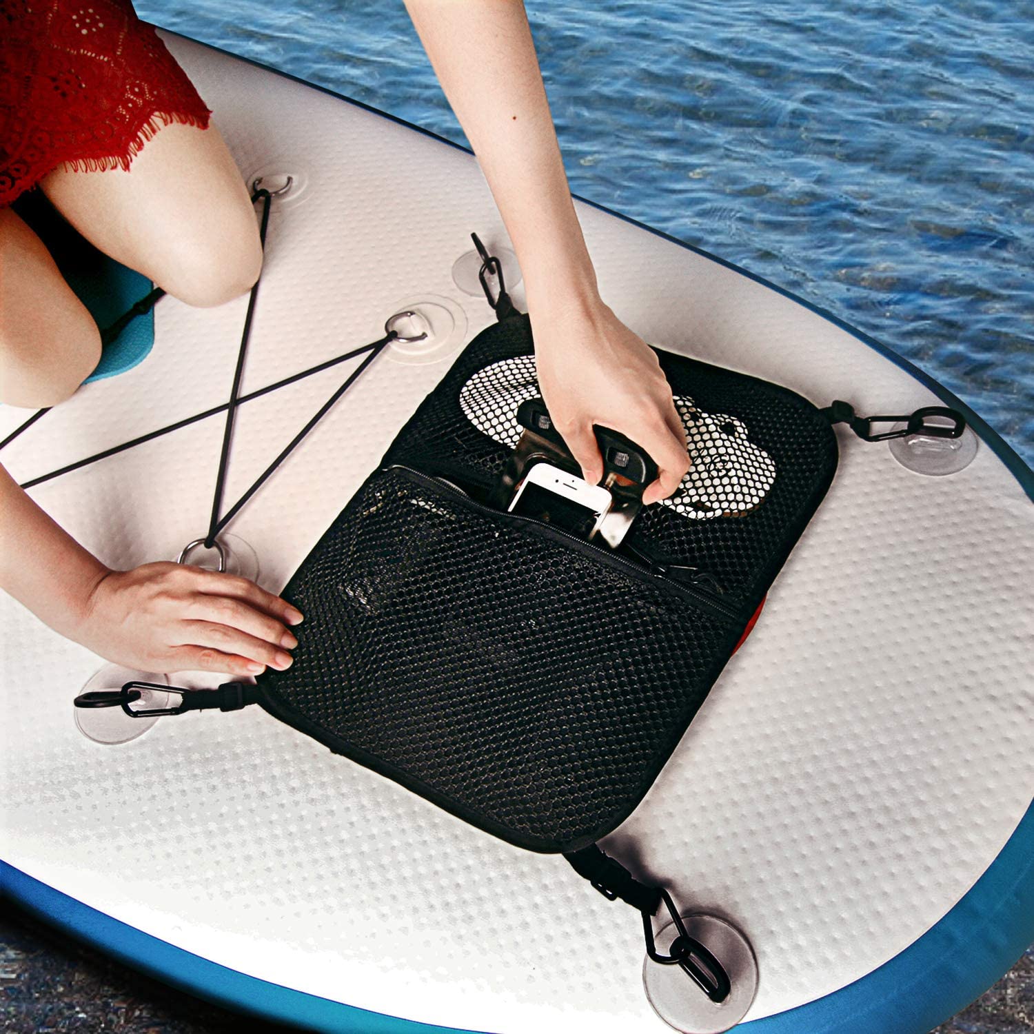 The bag's secure attachment is ensured by four strong D-Rings patches with adhesive backs, providing a worry-free experience even during intense paddleboarding activities. It is versatile, fitting various board types, and features adjustable straps for a perfect fit. Constructed with durable 600D Oxford fabric and mesh, this deck bag is built to withstand any paddling adventure and comes with a waterproof phone case for added protection.