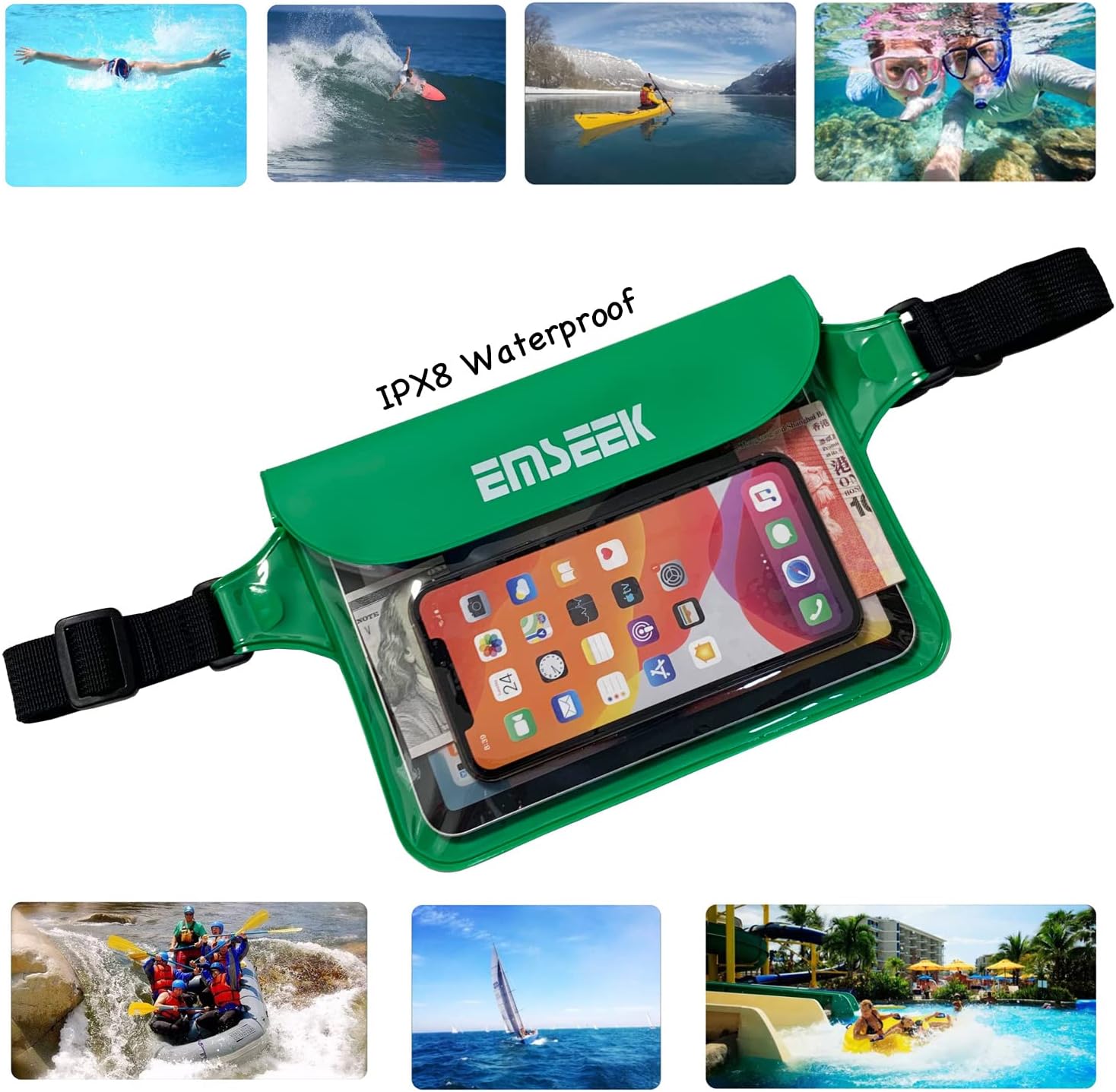 The EMSEEK Waterproof Waist Pouch is a versatile and reliable accessory for your water activities. Its IPX8 waterproof design protects your valuables up to 32 feet (10 meters) underwater, making it perfect for paddleboarding, swimming, and kayaking.