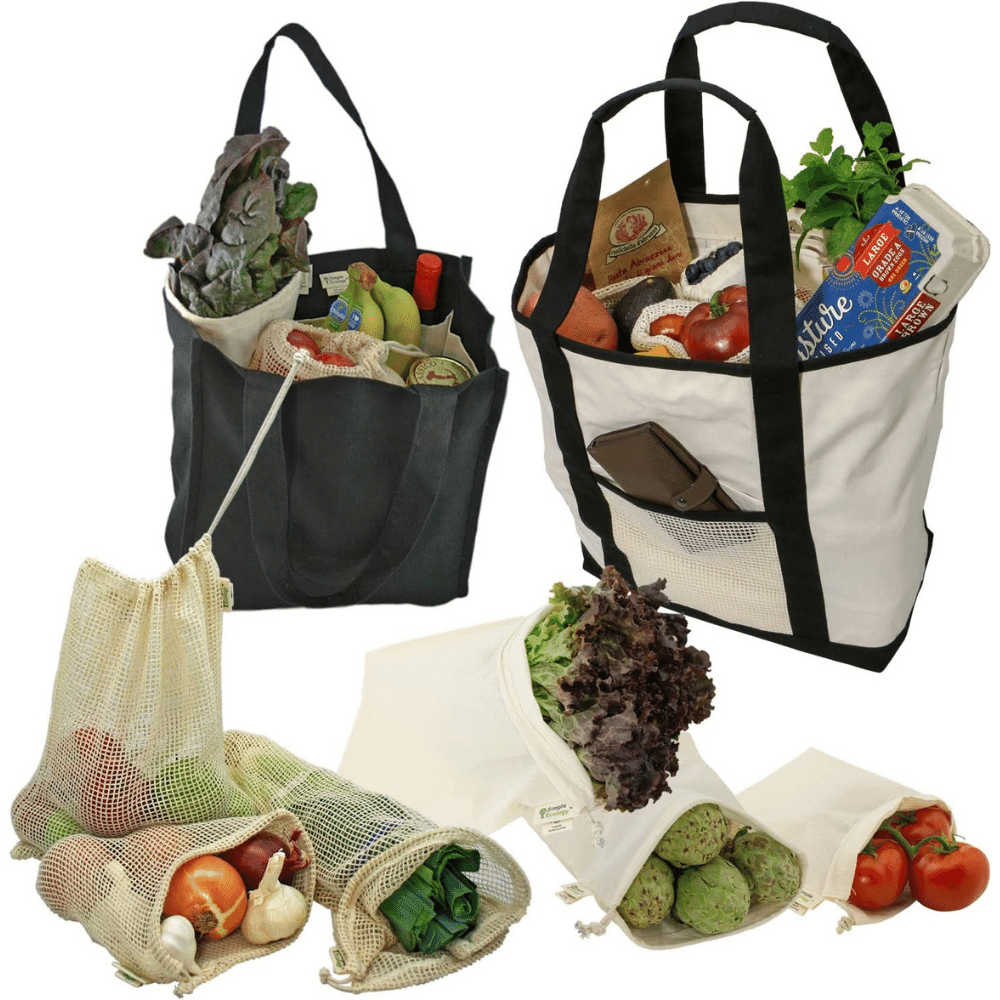 This perfect gift includes: XL Canvas and Jute Tote; Market String Bag; Muslin Produce Bag sizes L, M; Mesh Produce Bags sizes L, M.