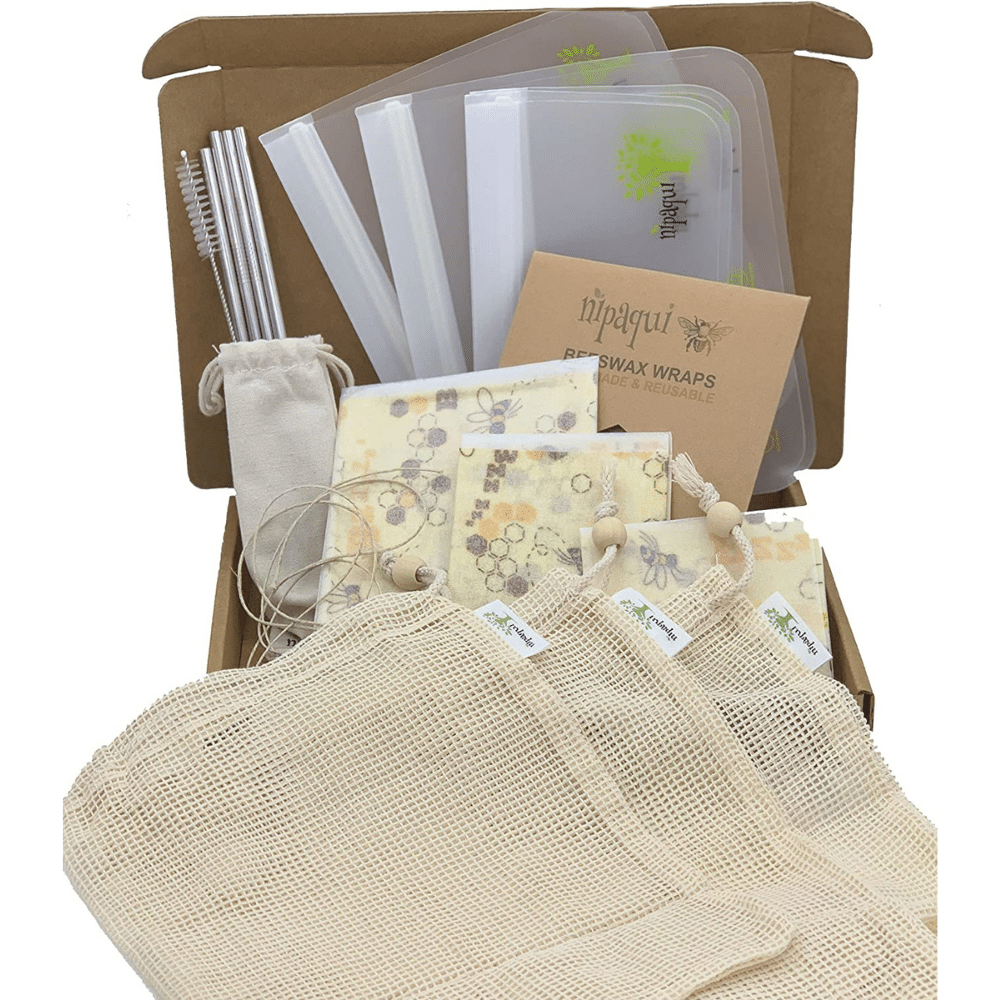 Looking for a kitchen gift for someone who is eco-friendly? You can gift an eco-friendly kitchen & home set. Our fav Kitchen and Home Zero Waste Starter Kit includes food storage bags, beeswax food wraps, mesh produce bags, and reusable straws.